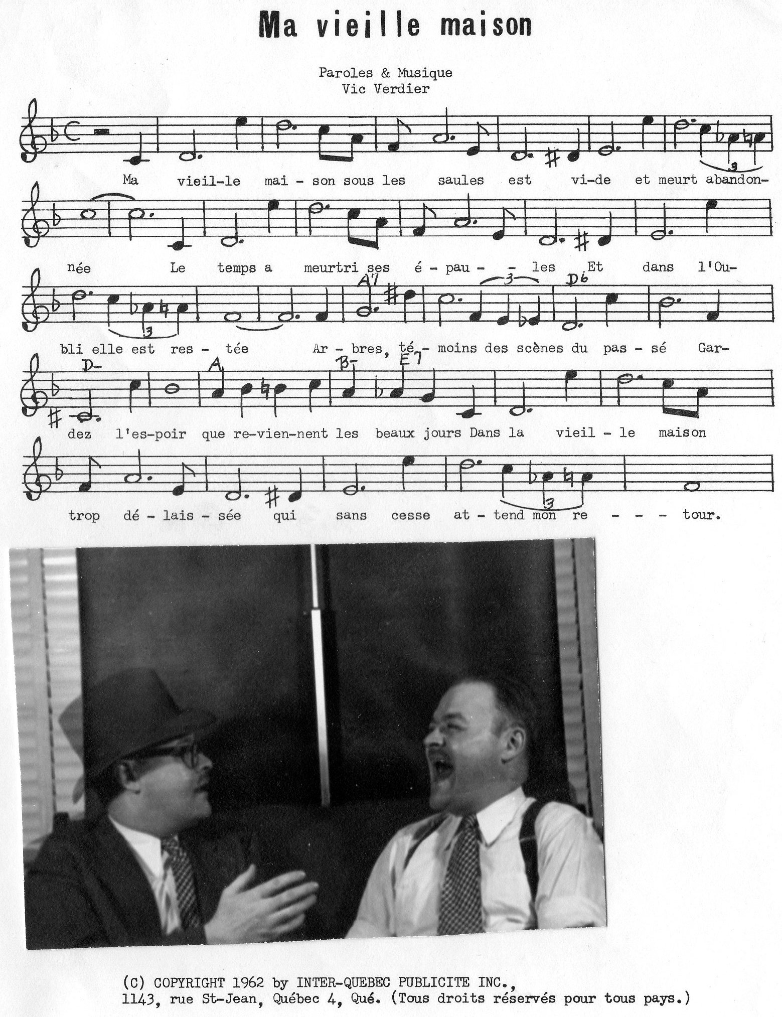 Dans les années ‘40, on ne mélangeait pas les rôles : on était soit un respectable homme d’affaires (membre des Lions et des Chevaliers de Colomb), soit un artiste. Pas les deux. Donc, Papi décide de s’inventer le pseudonyme de Vic Verdier pour laisser libre cours à ses envies artistiques. Caché sous cette nouvelle identité – ça sonne bien, non ? –, il compose des vers et de la musique. Je crois même que certaines de ses mélodies seront jouées à la radio, quelques fois, pas souvent.