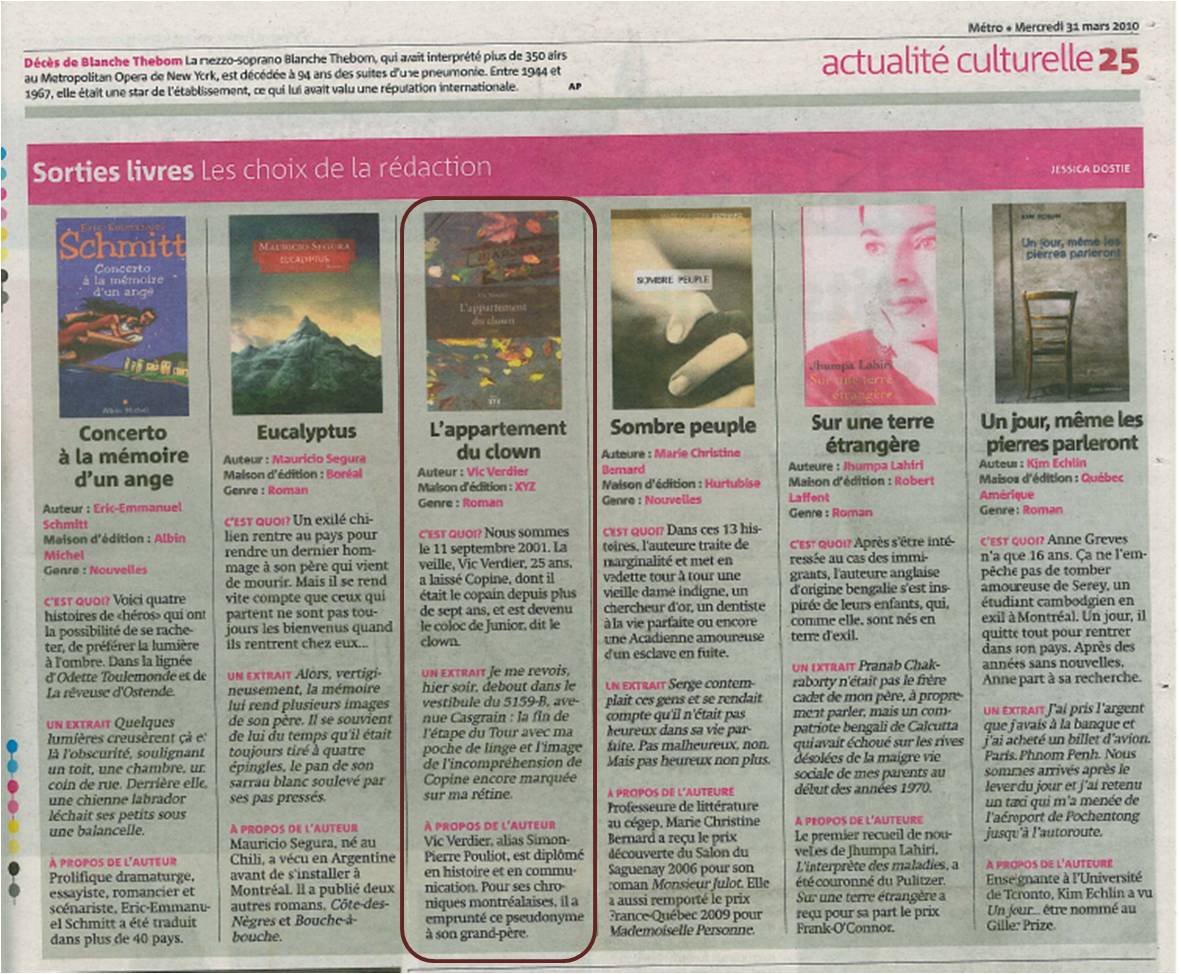 Le journal… Métro. Comme je le disais plus tôt, on m’a aimablement mentionné dans les choix de la rédaction, le 31 mars dernier. Puisque, comme Thomas, plusieurs ont besoin de voir pour croire – moi le premier -, voici une preuve. (Tu as remarqué que je côtoie M. Shmitt? Il doit être fier de se trouver côte à côte avec le Verdier…)