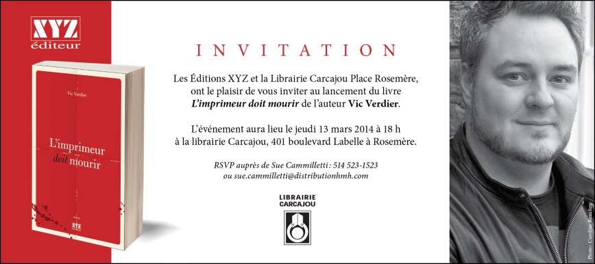 Lancement de « L’imprimeur doit mourir » Publié le 24 février 2014 par Vic Verdier « L’imprimeur doit mourir » sera lancé à la Librairie Carcajou de Rosemère, le 13 mars 2014, dès 18h. Tu es le bienvenu! Partager : Partager sur Facebook(ouvre dans une nouvelle fenêtre) Facebook Partager sur X(ouvre dans une nouvelle fenêtre) X J’aime chargement… Similaire
