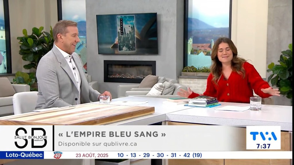 L’Empire bleu sang a reçu des éloges de la part de la chroniqueuse livres de Salut bonjour. Clique ici! Ça commence à 3:50… et j’en suis bien fier.